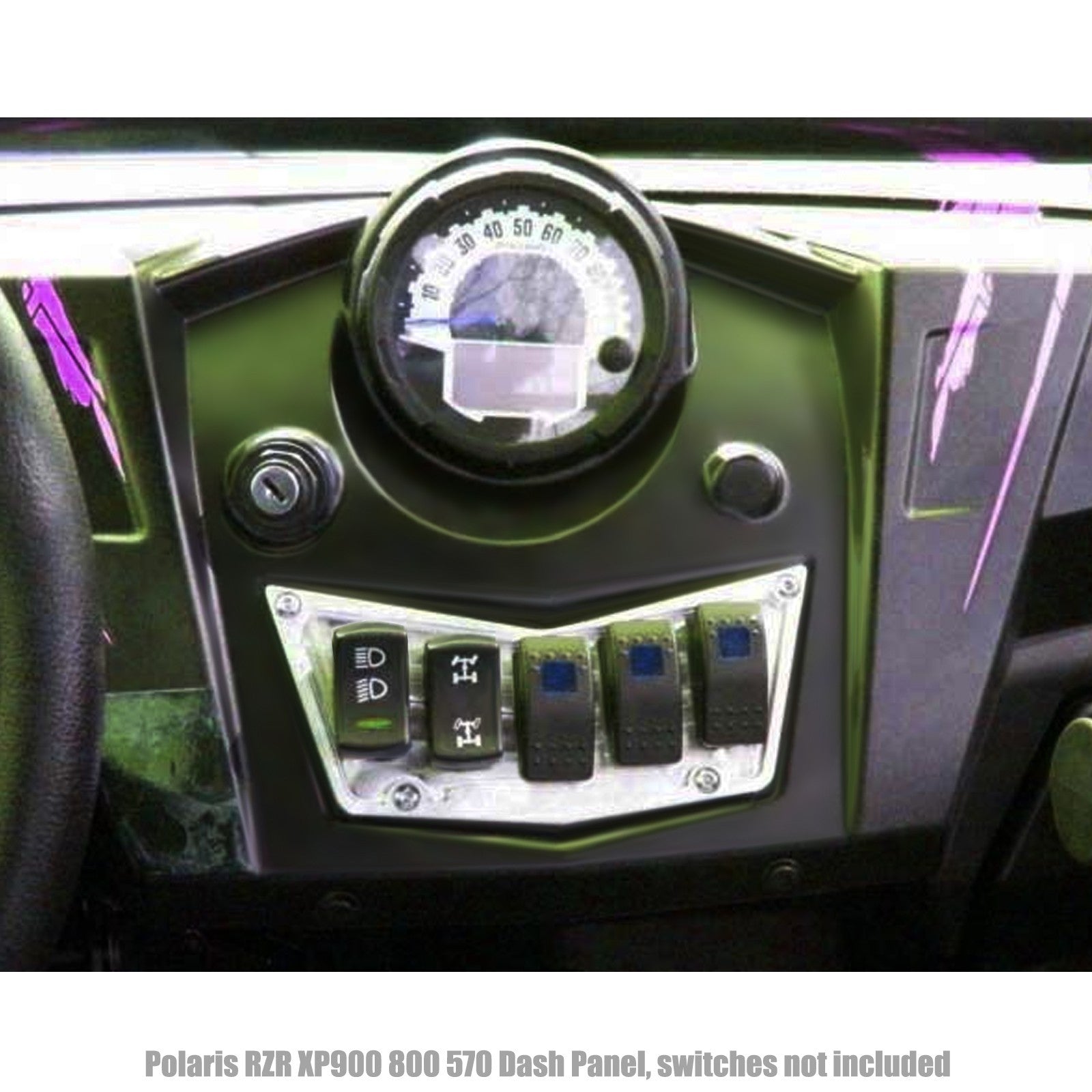 5 Switch Billet Aluminum CNC Dash panel upgrade for your RZR 570, 800, or XP 900. This panel allows you to add additional switches for lights and accessories. Made in Las Vegas, NV!