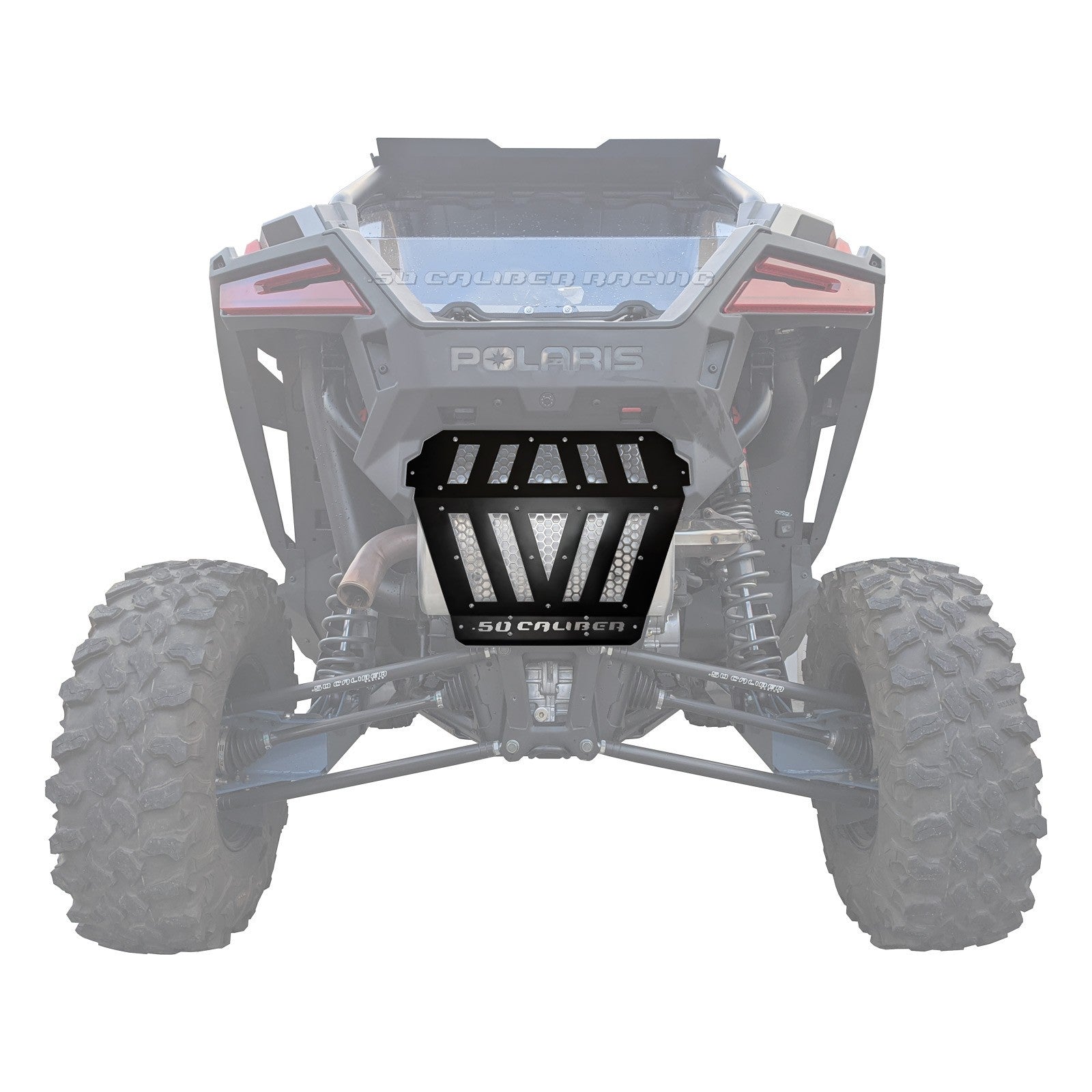 Custom vented exhaust cover for Polaris RZR PRO XP. Get rid of the ugly stock plastic rear "bumper" panel and add a more aggressive look to your RZR. Black powdercoat steel frame with honeycomb mesh allows for increased cooling, better departure angles, and some killer unique style. CNC laser cut from thin gauge sheet steel with 50 Caliber Racing logo at the bottom. 100% made in the USA!