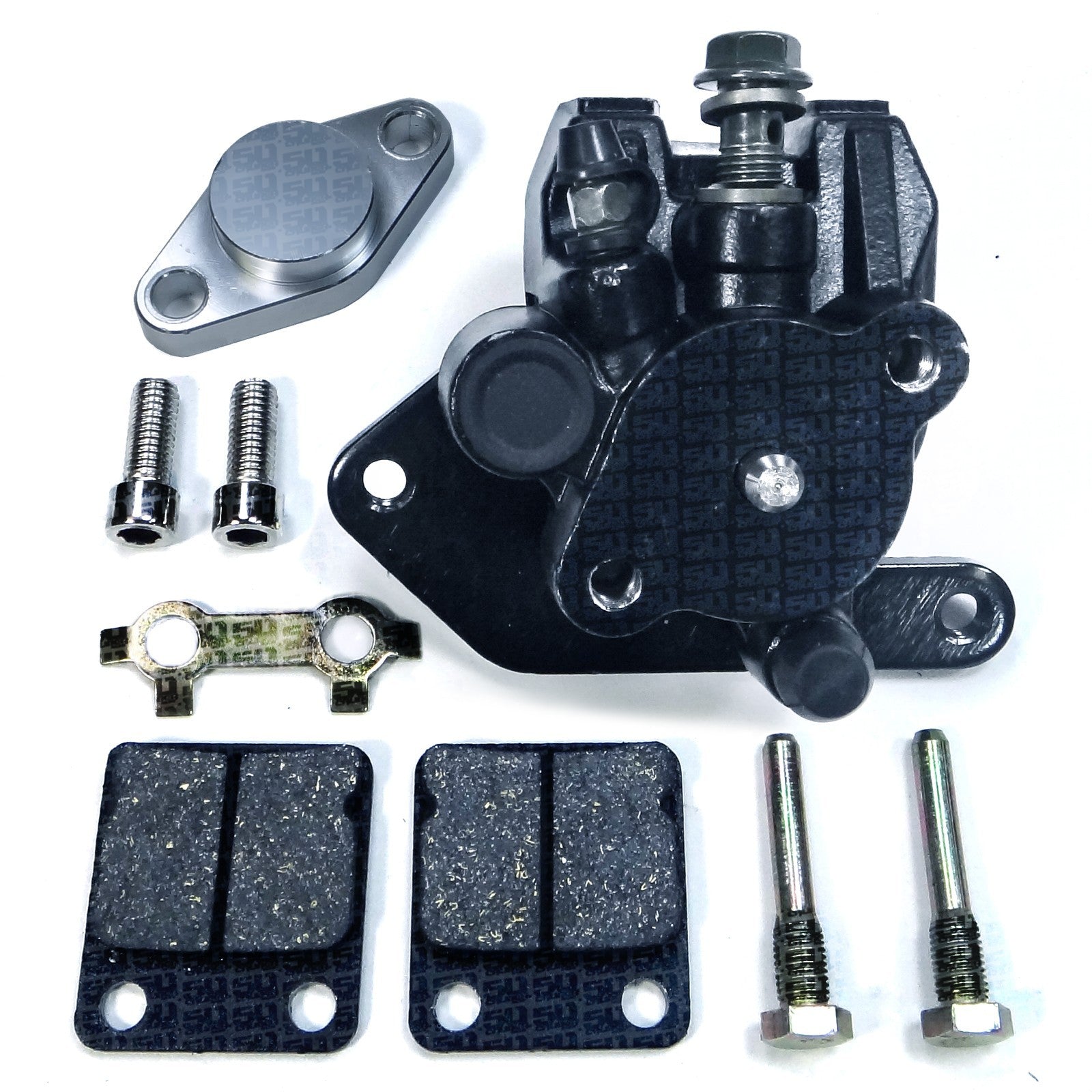 Will fit Raptor, Banshee, Blaster and Warrior. Brand new with 1 Year Warranty, 50 Caliber Racing dual piston Rear Brake Caliper assembly for your Yamaha ATV. Includes billet parking brake block off plate which is removeable in order to maintain the use of your existing parking brake. Comes with new Pads, mounting bracket and assembly hardware shown. Manufactured to OEM spec for an exact fit, simply mount the Brake Caliper then attach brake line... remove, replace and ride!